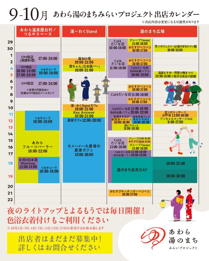 あわら温泉街がもっと楽しくなる!来たくなる!暮らす人にとっても、訪れる人にとっても魅力的なあわら温泉街に発展するため、日常の風景に少しずつ変化を加えてみる実験を行います!観光客の方だけでなく、地元や近隣住民も日常的に温泉街に出向いて、まち歩きを楽しめるような空間を目指していきたいと思っています。是非出店カレンダーをご覧いただき、あわら湯のまち広場の出店、イベント情報と合わせてご覧いただき、遊びに来てください。