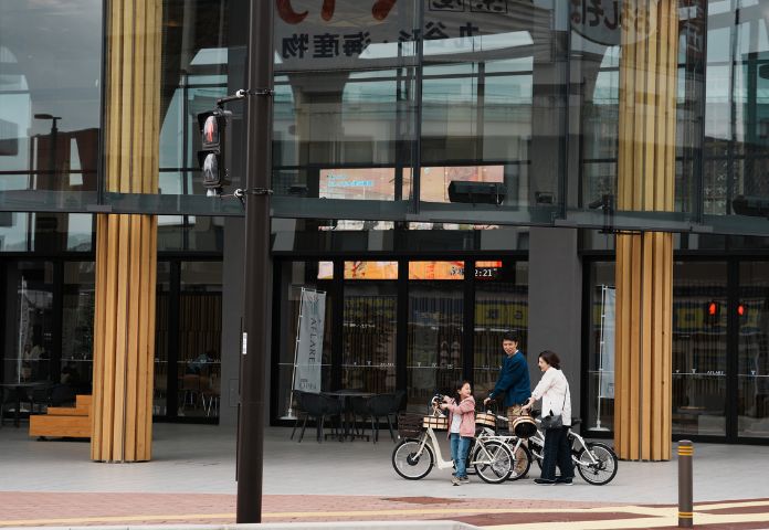 駅前に人が集まり、子どもが商店で買い物をし、観光客が自転車で海へ向かう。その風景の中心には、静かに人と人をつなぐ場所がある。