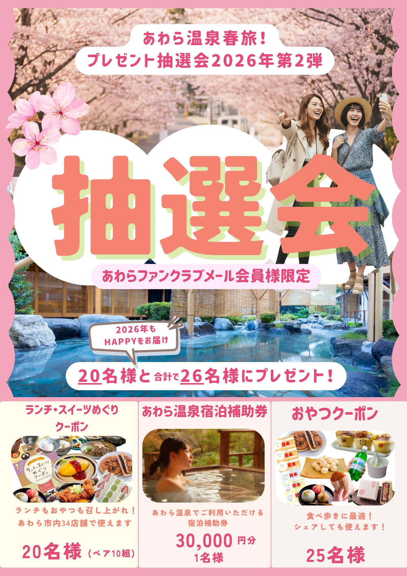 あわら温泉からHAPPYをお届けしたく、会員様限定の【豪華プレゼントが当たる!】プレゼント抽選会2026年第2弾を開催いたします!
