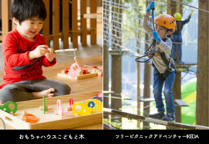 - ツリーピクニックアドベンチャーIKEDA【屋外】:110㎝以上から参加できるキッズコースがあり、お子様の挑戦する姿が見られます。インストラクター付きで安心。(有料)