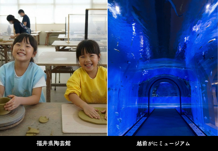 - 福井県陶芸館【屋内外】:越前焼を見て学ぶ資料館の他、陶芸体験、お点前体験、敷地内には越前陶芸公園もあり大型遊具もあります。(有料)