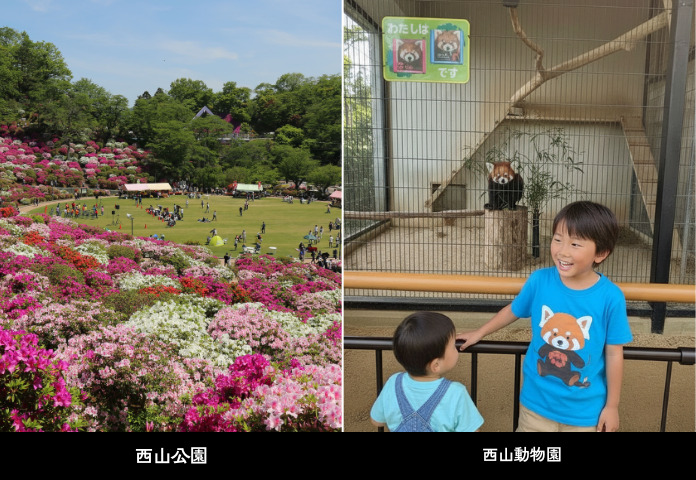 - 西山公園【屋外】:約5万株のつつじが咲き乱れるつつじの名所としても知られる公園。見頃は5月初旬。園内には広い芝生広場やレッサーパンダをモチーフにしたユニークな遊具があり、レッサーパンダが人気の西山動物も敷地内にあります。(無料)