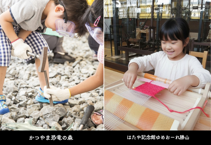 - はたや記念館ゆめおーれ勝山【屋内】:伝統的な織物産業の歴史や技術を学べる他、はたおり体験、まゆ玉クラフトなど幼児でも大人同伴で楽しめる体験も充実。(入館無料)