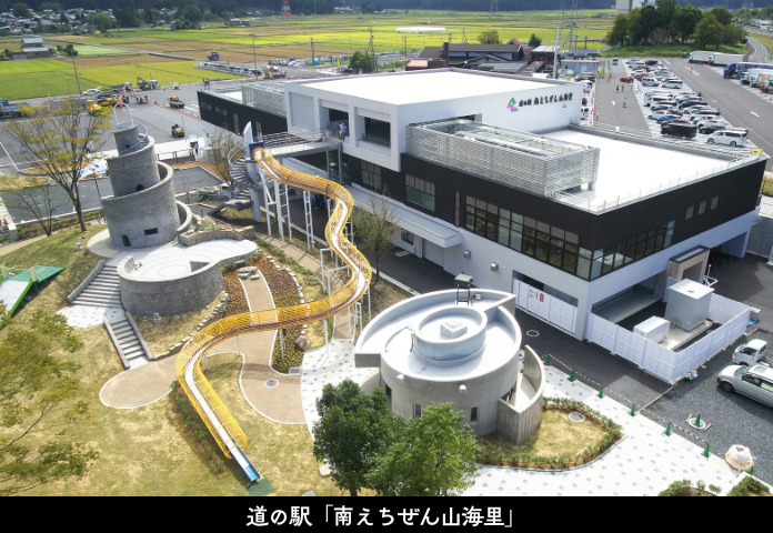 - 道の駅「南えちぜん山海里」【屋内外】:食べる!買う!だけではなく、ちびっ子連れの家族が1日中遊べる道の駅。ガラス面を登る「ミニボルダリング」や「ハイハイゾーン」などがあり、屋外につながるのロングすべり台が楽しい!また、夜の公園ではプロジェクションマッピングを上映することもあります。(無料)