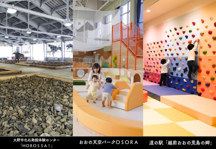 - おおの天空パークOSORA【屋内】:0歳~遊べる屋内型の子ども遊び場施設。大野城をモチーフにした「タワー遊具」など大野の魅力をテーマにした12の遊具が並びます。(大野市外有料)
