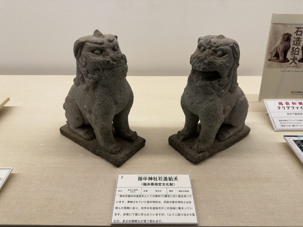 やっぱり「狛犬(こまいぬ)」ですね。福井県の特産であった笏谷石で造られた、いわゆる越前狛犬が、あわらには福井県で最も古いものとして2体あります。1体は沢の春日神社、もう1体は指中神社にありますが、指中神社の狛犬は小さくて可愛らしいのですが、盗難の危険があることや、皆に知ってもらうために、現在は資料館に寄託していただき展示しています。